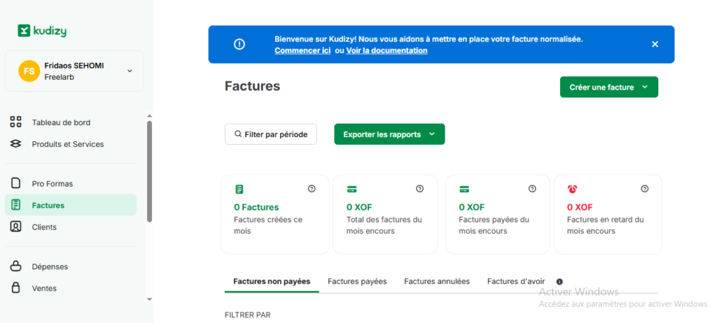 Kudizy adopte une approche différente en proposant une plateforme conçue pour aider les entrepreneurs à gérer leurs finances de manière claire et structurée. La facture normalisée y est intégrée comme une fonctionnalité parmi d’autres, au service de l’organisation financière de l’activité.