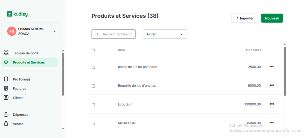 Kudizy propose un espace dédié à la gestion des produits et services. Ils peuvent être créés à l’avance, organisés et sélectionnés rapidement lors de l’émission d’une facture, ou importés depuis un fichier Excel. Cette organisation permet de retrouver facilement ses articles et de les réutiliser sans avoir à les recréer à chaque facture.
