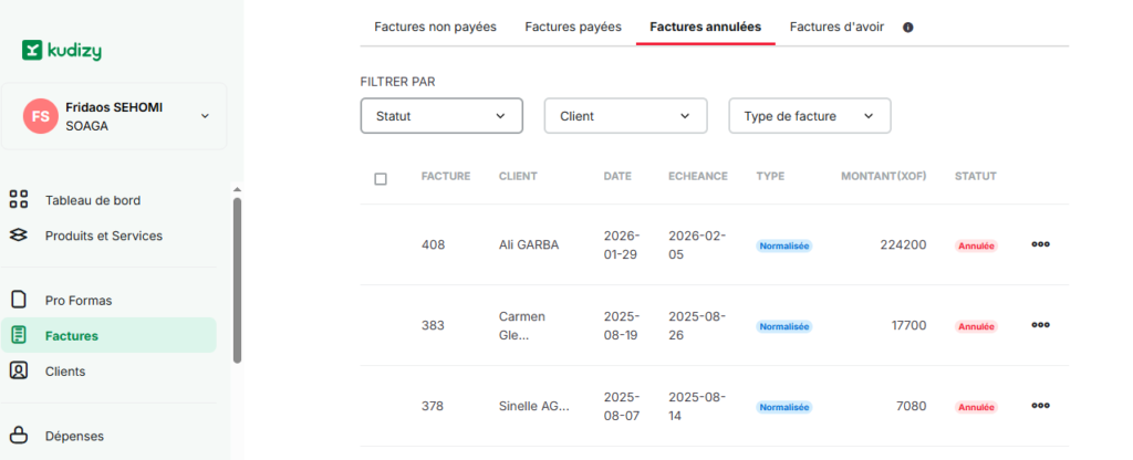 Sur Kudizy, les corrections et annulations se lancent directement depuis la facture concernée. Les documents conformes sont générés automatiquement, ce qui limite les ressaisies et simplifie le processus, tout en respectant les règles en vigueur.